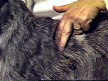 The most evident change occurred some time in the 1920s, when face and leg furnishings became more profuse. For show dogs, this added hair served two purposes. First, it gave the dog a more glamorous appearance, thereby increasing the breed's popularity with the general public. Second, it enabled artful trimmers to disguise defects in their show dogs. Dorothy Caspersz and other conservative fanciers argued the benefits of the original coat: that the dog required almost no trimming to maintain his appearance, and the correct coat repelled both water and dirt. It is impossible today to say with certainty whether modern coats are really softer than the turn-of-the- century coats, but the fad of the 1930s for whiskers and furnishings has become a fact today, as has trimming. The 1993 STCA Standard was the first to address the issue of trimming: "The coat should be trimmed and blended into the furnishings to give a distinct Scottish Terrier outline. The dog should be presented with sufficient coat so that the texture and density may be determined. The longer coat on the beard, legs, and lower body may be slightly softer than the body coat but should not be or appear fluffy." A properly presented Scottish Terrier coat is trimmed by pulling out the hairs. This is accomplished either by plucking the hair with finger and thumb, or by pulling the hair with a specially-designed knife. This process is commonly referred to as "stripping" the coat, and the knives are called "stripping knives." Properly presented, the jacket should look clean and shiny and lie flat and tight around the muscular body. When examined closely, the outer coat of the jacket should be long enough so that the crisp texture of the hair can be felt. When the hair is parted, the soft undercoat should be easily seen. Ideally, one should not be able to see the skin on a correctly-coated Scottish Terrier, but most groomers today remove much of the undercoat. Only the throat, cheeks, and the backs of the ears may be clippered. Lazy trimmers frequently clip the side of the neck, the shoulders, the topskull, and the rear. This should be penalized since it softens the texture of the coat in those areas. |