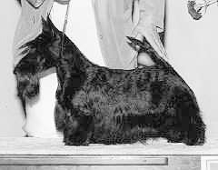 The craze for profuse furnishings peaked in the early 1950s when so much leg hair was exhibited that Scotties nearly lost their tailored, workmanlike appearance. Exhibitors have, to a large extent, returned to sanity in this regard. The furnishings should never be fluffy or matted, nor should they be so long as to drag on the ground. All four legs and some "daylight" should be plainly visible under the dog. This is accomplished by stripping the furnishings. If done correctly, the texture of the furnishings will also be harsh, although, because the hair is longer, it will feel somewhat softer than the hair of the dog's jacket. Unfortunately, too many exhibitors today shape the leg furnishings with scissors and thinning shears and then restore the texture by adding mousse or hair spray. Below are some examples of correctly trimmed dogs.