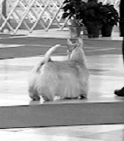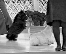 Although the Scottish Terrier standard has no actual disqualifications listed, the following language constitutes a "virtual" disqualification: "No Judge should put to Winners or Best of Breed any Scottish Terrier not showing real Terrier character in the ring." When judging, this means that you can eliminate all of the timid dogs, regardless of their other outstanding qualities. Too often, when faced with an otherwise excellent dog skulking around the ring and a poor quality dog showing up a storm, judges award ribbons to the skulking dog. This is contrary to the standard. If you only have one dog showing correct temperament, and you don't like it, withhold the ribbons. What is "real Terrier character?" A real Terrier is confident, active, alert, fearless, and scrappy.